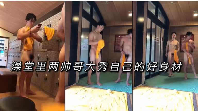 澡堂里两帅哥大秀自己的好身材