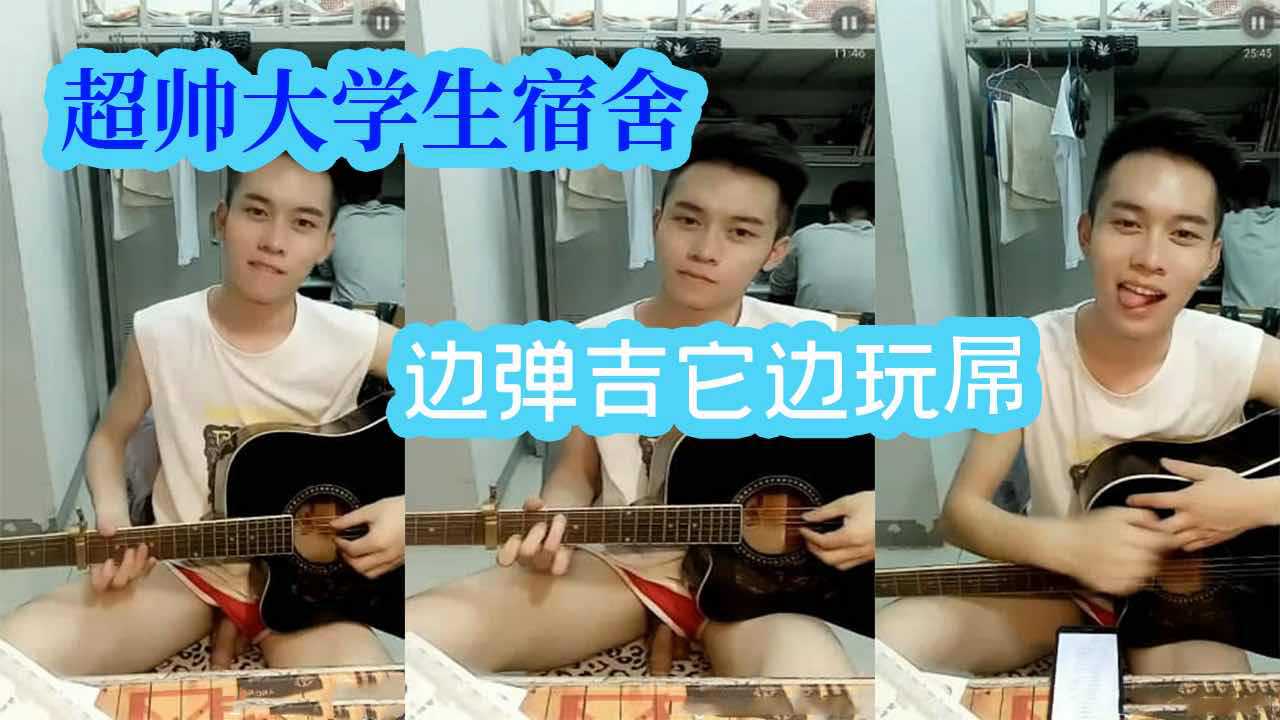 超帅大学生宿舍边弹吉它边玩屌