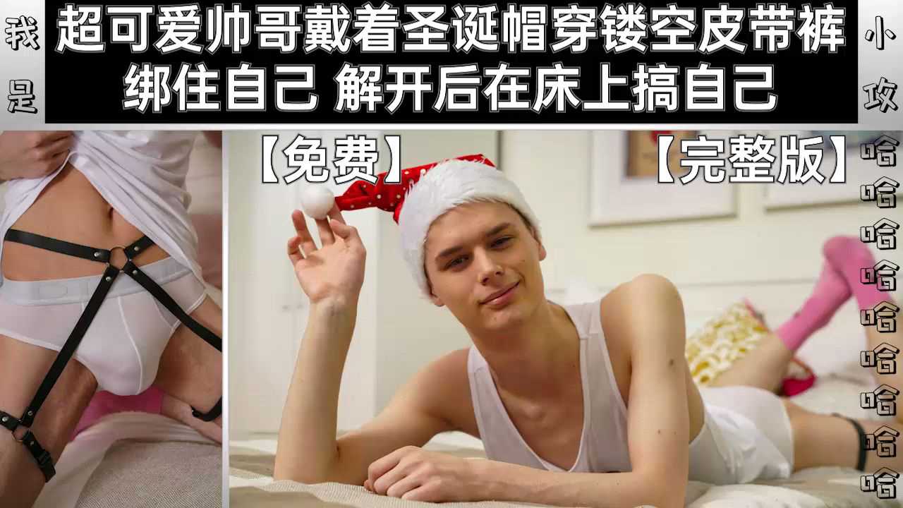 超可爱帅哥戴着圣诞帽穿镂空皮带裤 绑住自己 解开后在床上搞自己