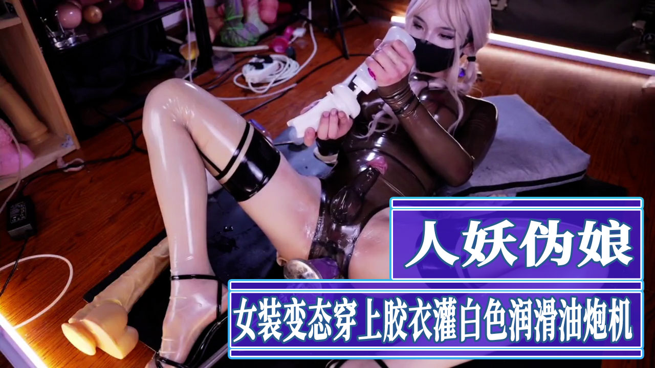 人妖伪娘女装变态穿上胶衣灌入大量白色润滑油炮机